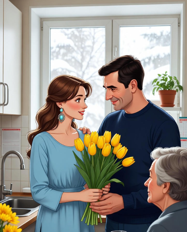 Катя потянулась, накинула Димину футболку и вышла на кухню босиком. На плите шипели сырники, в кофеварке булькало, а на столе уже стояла ваза с жёлтыми тюльпанами — теми самыми, что вчера вечером на рынке у метро продавала бабушка в пуховом платке.