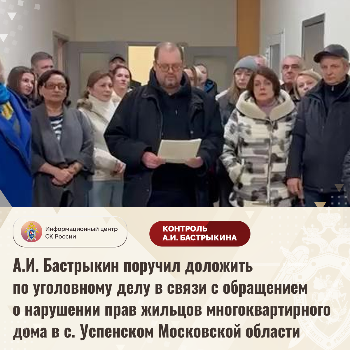 А.И. Бастрыкин поручил доложить по уголовному делу в связи с обращением о нарушении прав жильцов многоквартирного дома в с. Успенском Московской области В СМИ и социальной сети размещено видеообращение к Председателю СК России А.И. Бастрыкину жильцов многоквартирного дома в селе Успенском Московской области по вопросу нарушения их прав. После возведения здания в 2012 году его управление без согласования с собственниками захватило ООО «УК Эклад». При этом обязательства по обслуживанию строения не исполняются. Кроме того, с граждан взимаются коммунальные платежи по завышенным тарифам. Многочисленные обращения жильцов игнорируются. В ГСУ СК России по Московской области по данному факту возбуждено уголовное дело. Председатель Следственного комитета Российской Федерации Александр Иванович Бастрыкин поручил руководителю ГСУ СК России по Московской области Ярославу Александровичу Яковлеву представить доклад о ходе и результатах расследования уголовного дела. Исполнение поручения поставлено