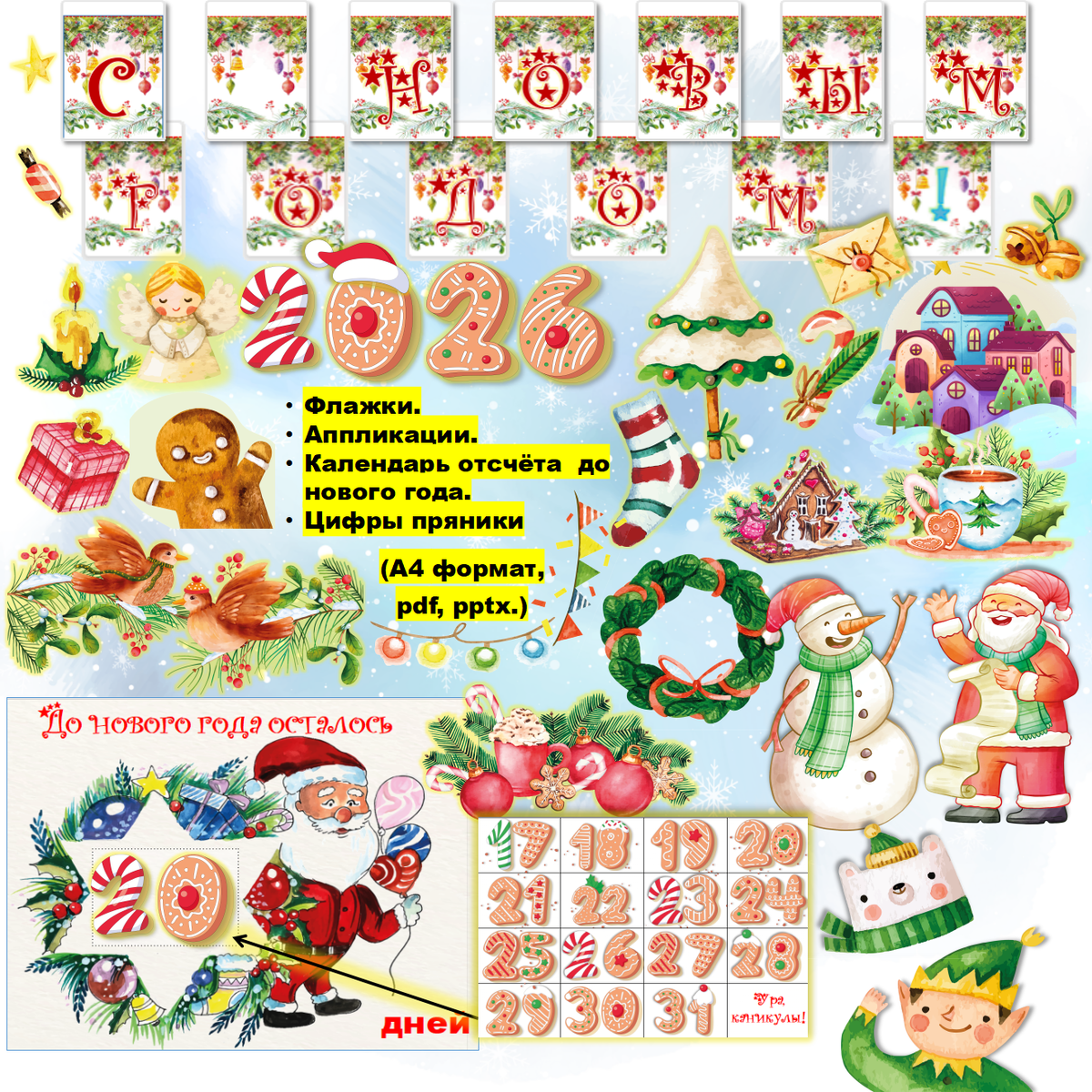 Набор оформления на Новый год: аппликации, флажки, плакат обратный отсчёт «до Нового года осталось дней», цифры пряничные. Аппликации акварельные на доску и окно, украшения класса, кабинета. Растяжка, гирлянда Этот новогодний набор станет отличным помощником для педагогов в подготовке праздничного оформления класса и создании атмосферы праздника среди учеников. Данный набор представляет собой удобный инструмент для быстрого и качественного оформления школьного пространства перед Новым годом, способствующий созданию радостной и вдохновляющей атмосферы для всех участников образовательного процесса. Преимущества набора: 1. Экономия времени. Готовые шаблоны позволяют быстро подготовить класс к празднику без больших временных затрат на создание декораций вручную.