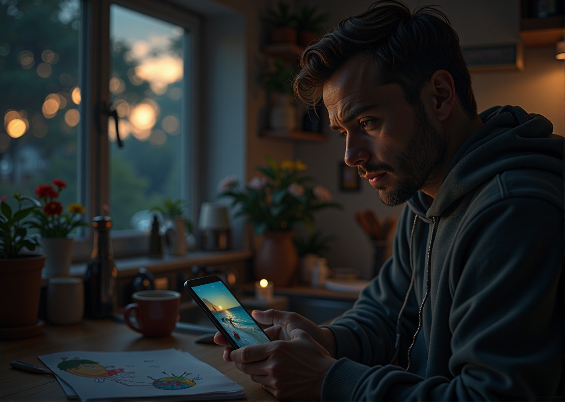 В тот вечер телефон казался тяжелее обычного. Я сидел на кухне, опершись локтем о стол, и лениво листал ленту, пока в кастрюле остывал суп. Оранжевый свет от лампы отражался в оконном стекле, за которым висела промозглая ноябрьская темнота. На столе — детский рисунок с кривым домиком, кружка с засохшей полоской кофе по краю, тарелка с недоеденной котлетой сына.
