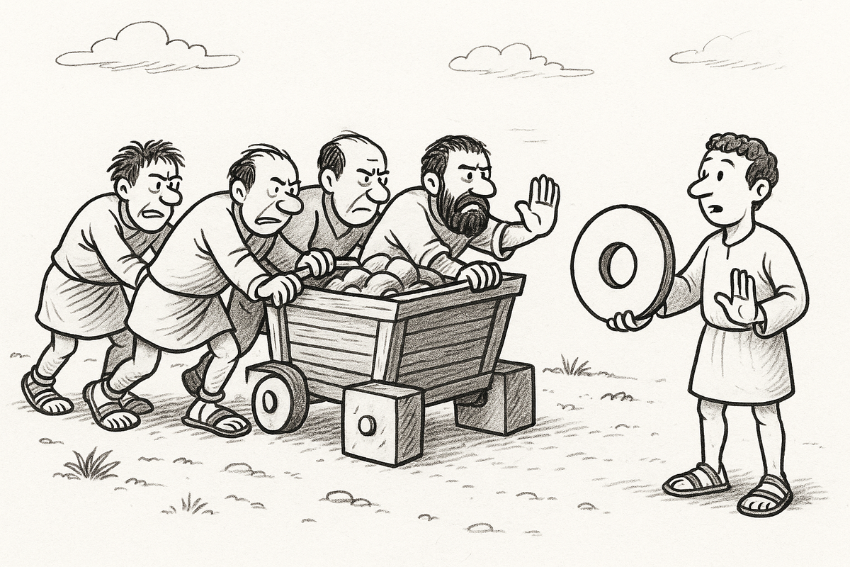 Эта установка напоминает популярный мем: группа мужчин тянет телегу на квадратных колесах, а человек с круглым колесом стоит рядом и предлагает решение. Ответ неизменен: «Не мешай работать!»