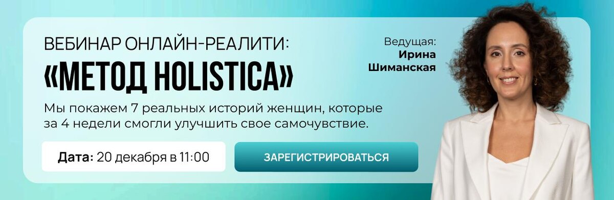 Когда уже будут результаты? Друзья, реалити шоу «Бережный ЗОЖ» это уникальный формат, которого мы не делали ранее. На протяжении 4 недель мы ведем 7 женщин и в режиме реального времени делимся с вами их изменениями. У них были непростые отправные точки: хроническая усталость, лишний вес, гипотиреоз, воспаление, бессонница, проблемы менопаузы и предменопаузы. ❌Некоторые участницы отказались продолжать. И мы хотим честно показать вам, какой путь прошла каждая из женщин, с какими трудностями столкнулась, страхами, сомнениями и получилось ли у них достичь желаемых улучшений. Участницы сами расскажут вам, как все было на самом деле. Об этом вы узнаете в последней серии реалити на онлайн вебинаре: «Метод Holistica»🔥 💫20 декабря в 11:00 👉 ЗАРЕГИСТРИРОВАТЬСЯ Мы подробно разберём путь каждой участницы: - что они реально делали, - какие рекомендации получили, - что получилось внедрить, а что давалось тяжелее всего, - с какими страхами и сопротивлением столкнулись, когда хотели выйти