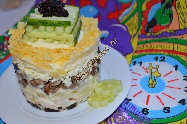 Новогодний салат «Венеция» Ингредиенты: Чернослив - 200 гр. Куриная грудка - 400 гр. Картофель - 350 гр. Грибы шампиньоны - 400 гр. Яйцо - 3 шт. Сыр - 200 гр. Огурцы свежие - 200 гр. Майонез - 350 гр. Масло оливковое - 40 мл. Источник: https://rusdinner.ru/page/novogodnij-salat-venecija