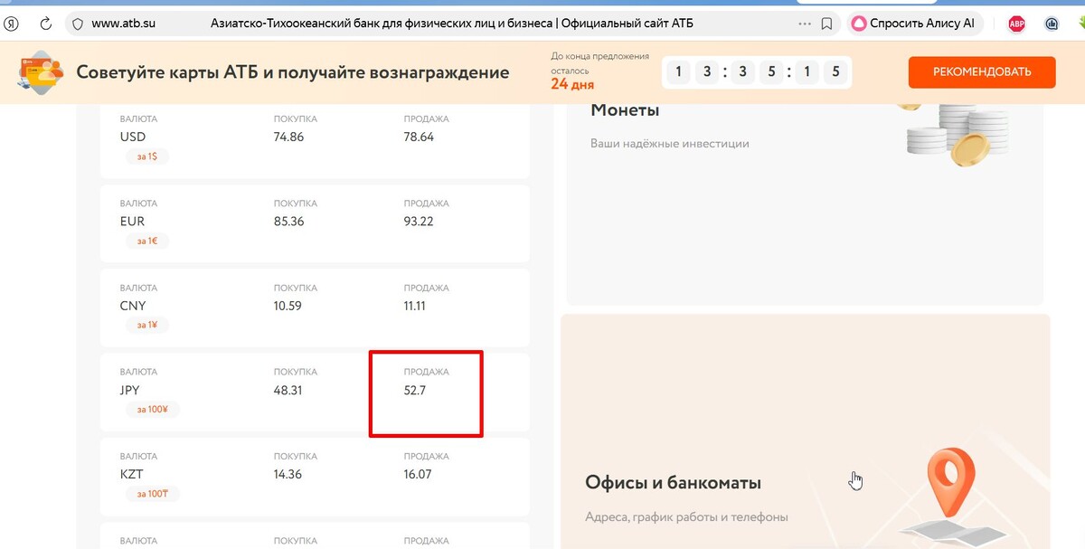 Сейчас очень выгодный период для покупки авто из Японии, аж по трем причинам. Во-первых, курс йены сейчас прям очень низкий. Вот скриншот с сайта АТБ. Во-вторых, есть шанс, что под Новый Год конкуренция будет меньше. Понятно почему: праздник на носу, многим людям не до машин.