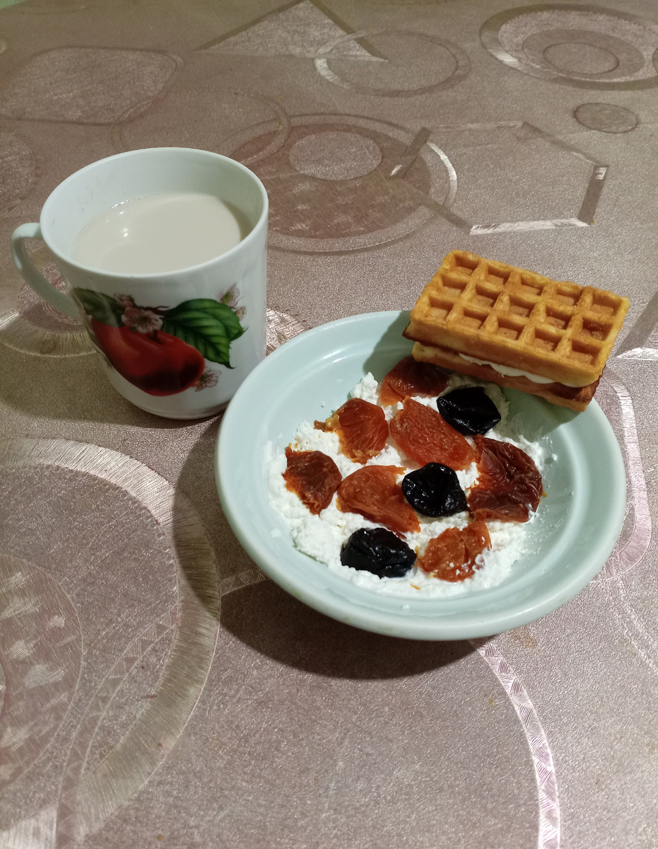 Добрый день подписчики и гости моего канала. Как прошла у меня пятница? Спала долго до 12 часов дня, потому, что поздно ложусь спать. Я даже не слышу иногда будильник на телефоне, хотя он звонит в течение получаса. Раньше я просыпалась от любого шороха. В первую очередь конечно, как всегда помолилась, сделала зарядку, выпила стакан тёплой воды перед приёмом завтрака. Иногда выпиваю и два стакана, но обязательно только тёплой и кипяченой. На завтрак, как всегда у меня творог с курагой и черносливом, кофе с молоком и одна мягкая вафля с суфле и земляничным вареньем. ОЧЕНЬ люблю такие вафли, они были на акции, совсем не дорогие. Правда там такая акция, всего пару копеек скинули. Я раньше варила "Геркулес", который в пачке по 500 грамм на воде, но уже давно отпала охота его есть. Знаю, что полезна такая вязкая каша, но заставить сварить ее себе не могу. А ведь раньше я только и варила такую кашу. Вкусы наверное со временем меняются, но не на все. Как любила сладости,