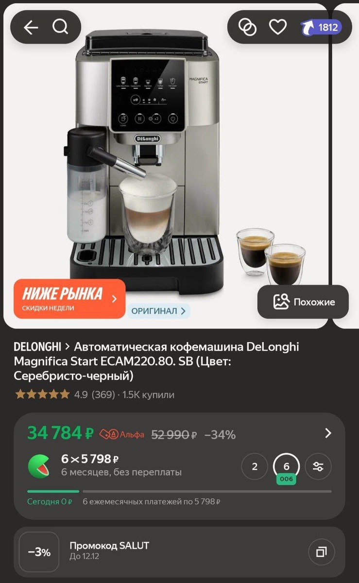 Автоматическая кофемашина DeLonghi Magnifica Start ECAM220.80. SB (Цвет: Серебристо-черный) за 34784₽ https://market.yandex.ru/cc/8Abfzu Швабра с отжимом и ведром Zetter M (10 л), серая, 2 насадки в комплекте за 3506₽ Промокод за подписку на магазин: MZC588RM https://market.yandex.ru/cc/8Abdur