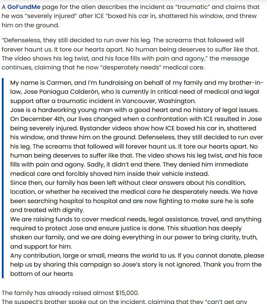 ICE RUN OVER ILLEGAL to INSANE SCREAMS of PAIN 'Multiple X-rays show 0 fractures from Oscar-level performance' — DHS But GoFundMe earns almost $15K for alien 'victim' — Washington state reports/footage from Gateway Pundit