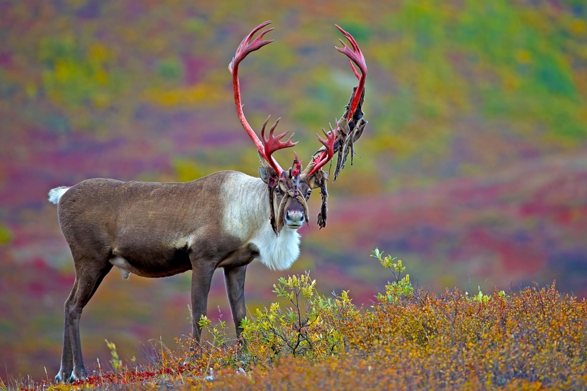 Здесь, среди бескрайнего моря тундры, где воздух звенит от тишины, а горизонт — это не линия, а состояние души, происходит ежегодное чудо. Фотографу удалось поймать момент, когда тундровый карибу, североамериканский аристократ ледяных просторов, занимается странным, почти интимным делом. Он трется рогами о ствол карликовой берёзы, сдирая с них лохмотья кроваво-красного бархата. Со стороны это выглядит так, будто воин снимает с доспехов чехлы перед решающей битвой. И это недалеко от истины.