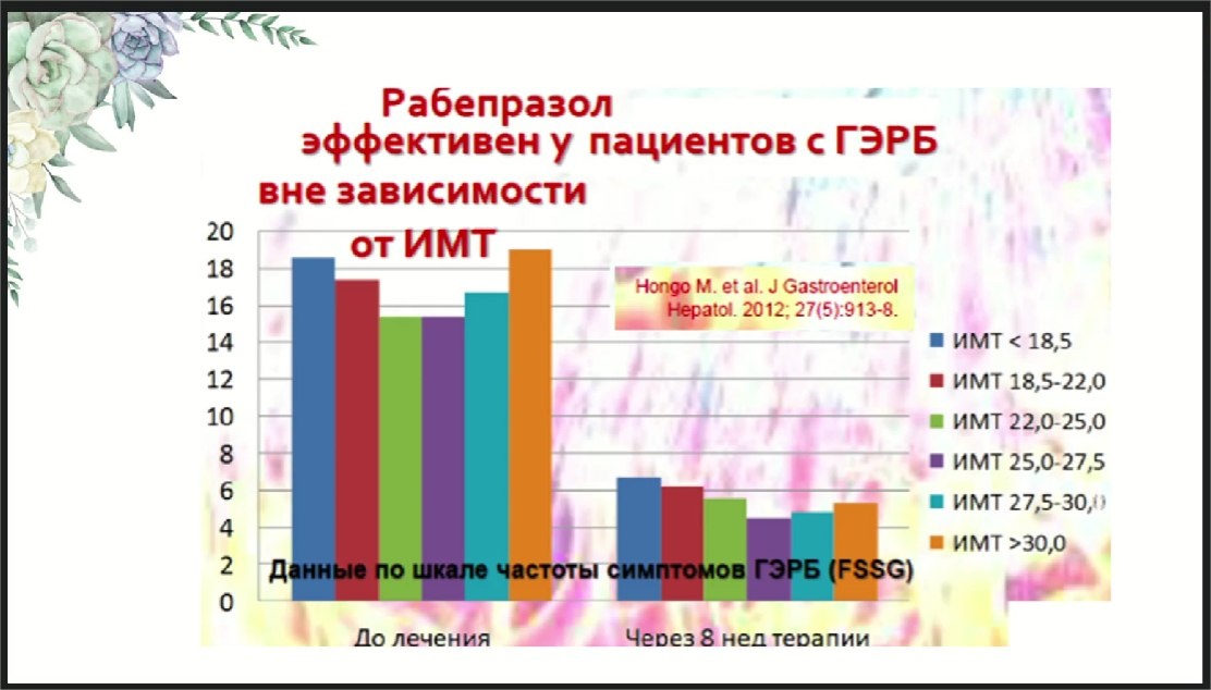 Знали ли вы, что эффективность ИПП может зависеть от ИМТ пациента. Исследование ученых из Японии показывает, что для Рабепразола ИМТ не имеет значение. Он одинаково хорошо работает как у пациентов с дефицитом массы тела, так и у пациентов с лишним весом при лечении ГЭРБ и других кислотозависимых заболеваний. P.S. Слайд из вебинара РГА "Управление эффективностью ИПП: на пути к максимальному результату в изменяющихся условиях" Докладчик: Елена Николаевна Карева, профессор кафедры молекулярной фармакологии и радиобиологии им. П. В. Сергеева РНИМУ им. Н. И. Пирогова, профессор кафедры фармакологии Первого МГМУ им. И. М. Сеченова