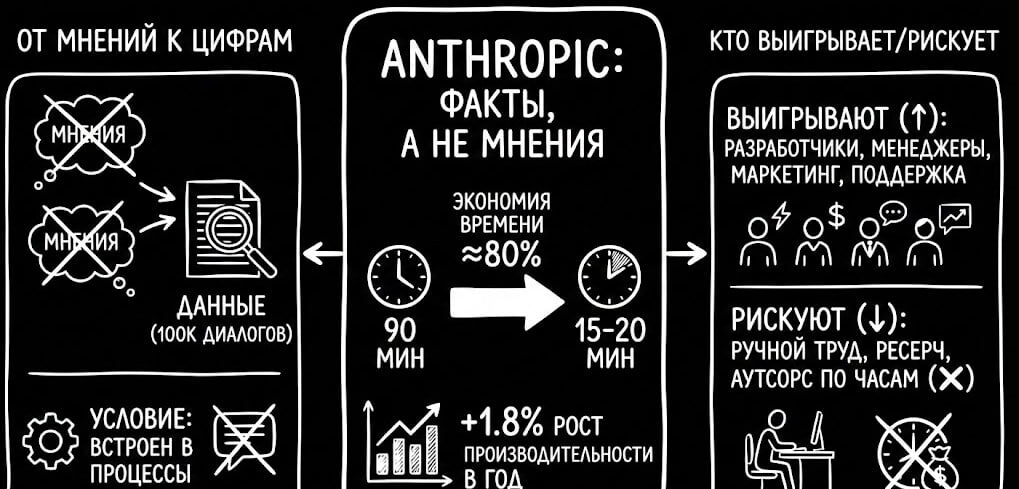 Текущий фон про Ai разделился на два лагеря. Кто то говорит "ИИ спасет экономику", кто то устало отвечает "по факту ничего не меняется". Anthropic наконец принесла не мнения, а цифры. Они проанализировали обезличенных 100 000 реальных рабочих диалогов с Claude и посчитали, как это бьется по профессиям и задачам. Коротко: при нормальном внедрении Ai может почти удвоить рост производительности в США, плюс 1.8 процента в год. На уровне задач это выглядит грубо: то, что занимало 90 минут руками, с ИИ превращается в 15–20 минут, то есть около 80 процентов времени уезжает в модель. Больше всего выигрывают: - разработчики, - операционные менеджеры, - маркетинг - и поддержка. Больше всего рискуют те, чья ценность пока: - в формате "руками делаю тексты, - ресерч, - простую админку". Плюс классический аутсорс на человеко часах: если задача сжимается с 90 минут до 15, модель "мы продаем часы" начинает ломаться ❌ В наших проектах за последние два года цифры похожие: когда ИИ встроен в процес