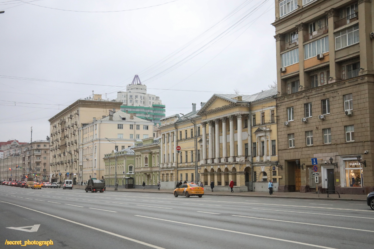 Когда выходишь со станции метро «Проспект Мира» радиальной линии, этот дом с колоннами бросается в глаза в числе первых. Он состоит как будто из нескольких фрагментов, странным образом соединенных между собой. Словно выстроили центральную часть с портиком из шести колонн коринфского ордера, водрузили поверх него треугольный фронтон и принялись пристраивать справа и слева разнокалиберные куски крыльев.