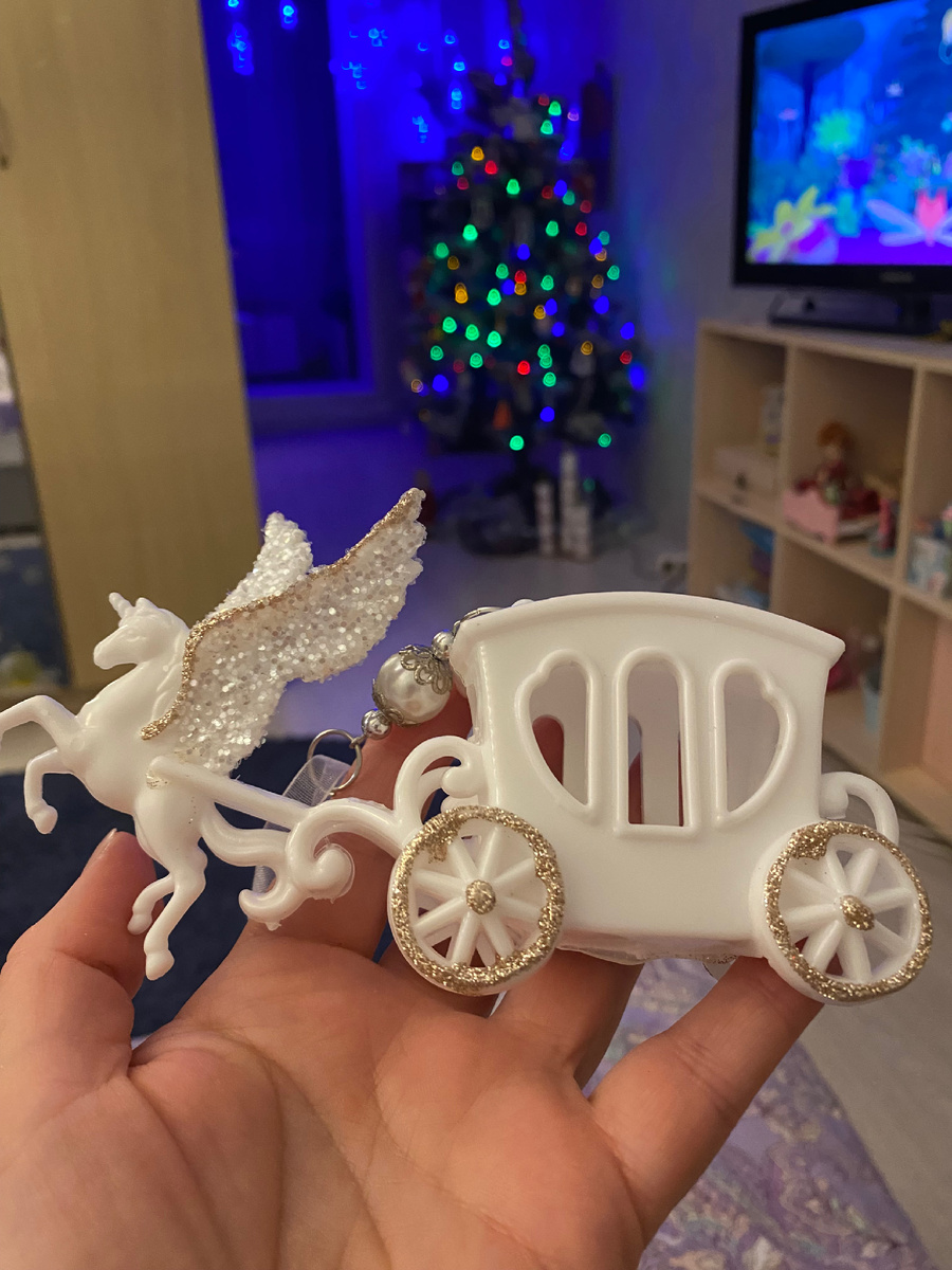Приобрела я новую новогоднюю игрушку на ёлку. Показалась она мне скучной или мне пару минут было скучно. Решила я новогоднюю игрушку – карету, украсить. Нашла в своей творческой коробочке стразы на клею. Украсила окна кареты синими камушками. Прозрачными стразами украсила крышу и части кареты. В результате получилась яркая и сияющая новогодняя игрушка. Мы повесили карету на нашу новогоднюю елку. До новых встреч 👋