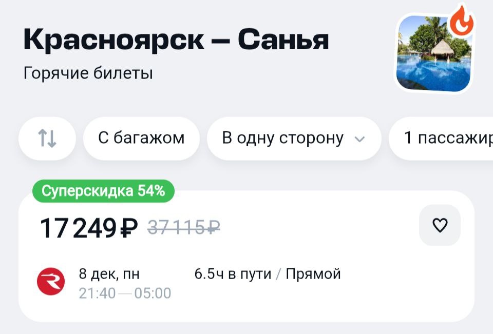 Завтра на Хайнань. Билет с багажом. https://aviasales.tpm.lv/ekJZazkr #SYX @KJA