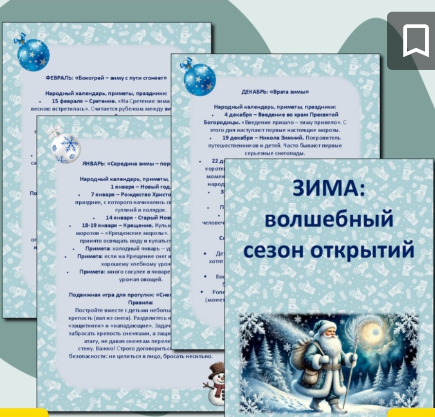 Папка-передвижка для детского сада в зимний период. «Зима: волшебный сезон открытий» — полноценный комплект для развития детей дошкольного возраста. Это не просто сборник фактов, а тщательно структурированный, яркий и практичный материал, который сэкономит вам часы подготовки и станет украшением групповой раздевалки. Экономия вашего времени и сил. Вам не нужно сидеть ночами, собирая информацию по крупицам из разных источников. Все уже готово: актуальные сведения, проверенные игры и красивое оформление. Просто распечатайте и разместите! Глубокая образовательная ценность. Папка знакомит детей и родителей с народной мудростью (приметы, календарь), культурными традициями (праздники) и дает практические инструменты для совместного досуга (игры).