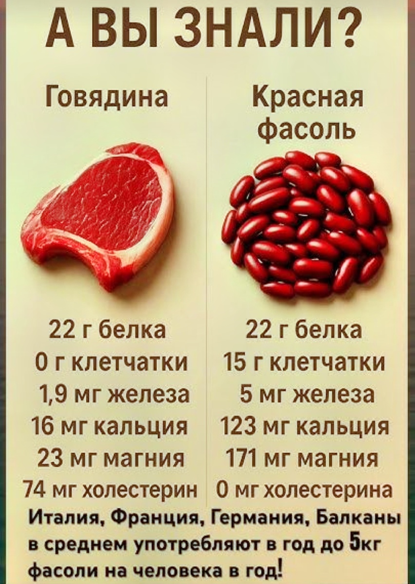 Сижу я как-то на кухне, перебираю фасоль для лобио, и вспомнился разговор на рынке: одна молодая женщина другой с жаром доказывала, что «фасоль — это теперь новое мясо». Заинтересовалась, полезла в свои старые справочники по пищевой ценности, да и современные данные посмотрела. Картинка, что гуляет сейчас в сети, где фасоль побеждает говядину по всем статьям, — она, конечно, глаз цепляет. Но жизнь, дорогие мои, как и хороший рецепт, всегда немного сложнее простой инфографики. Давайте, как на кухне, разложим все по чистым тарелочкам. Что правда? Правда — в цифрах. То, что в красной фасоли белка столько же, сколько и в говядине (примерно 22 грамма на 100 г) — чистая правда. И для бюджетного, полезного питания это отличная новость! Правда и в том, что фасоль — чемпион по клетчатке (её в мясе нет вовсе), по магнию и кальцию. И да, холестерина в ней ноль. Это делает её прекрасным постным продуктом и основой для множества вкусных блюд на каждый день — от супов до паштетов. Если смотреть на