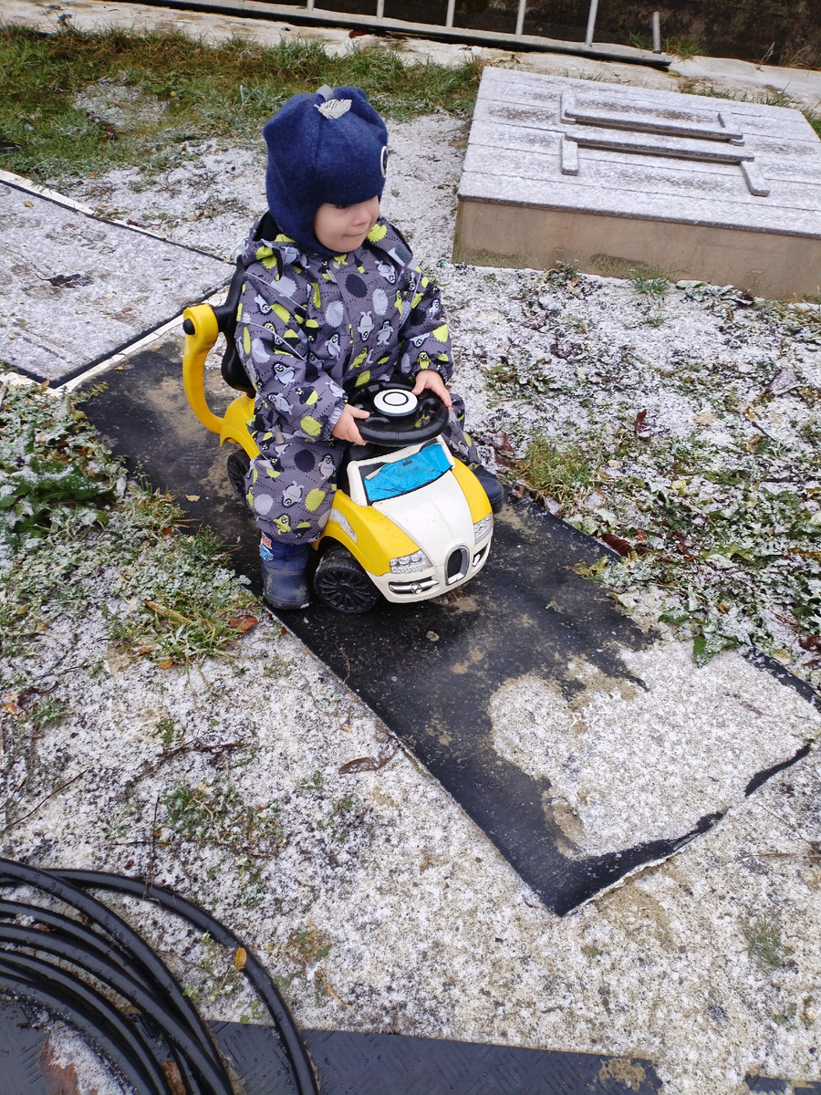 Сегодня вот что-то наподобие зимы вырисовывалось. Амелия счастливая такая была. Кричала: "Увааа! Сех беий" Прыгала по нему, топала, танцевала. Весь палисадник избегала. Я боялась, что о малину поцарапается. Радовалась так.