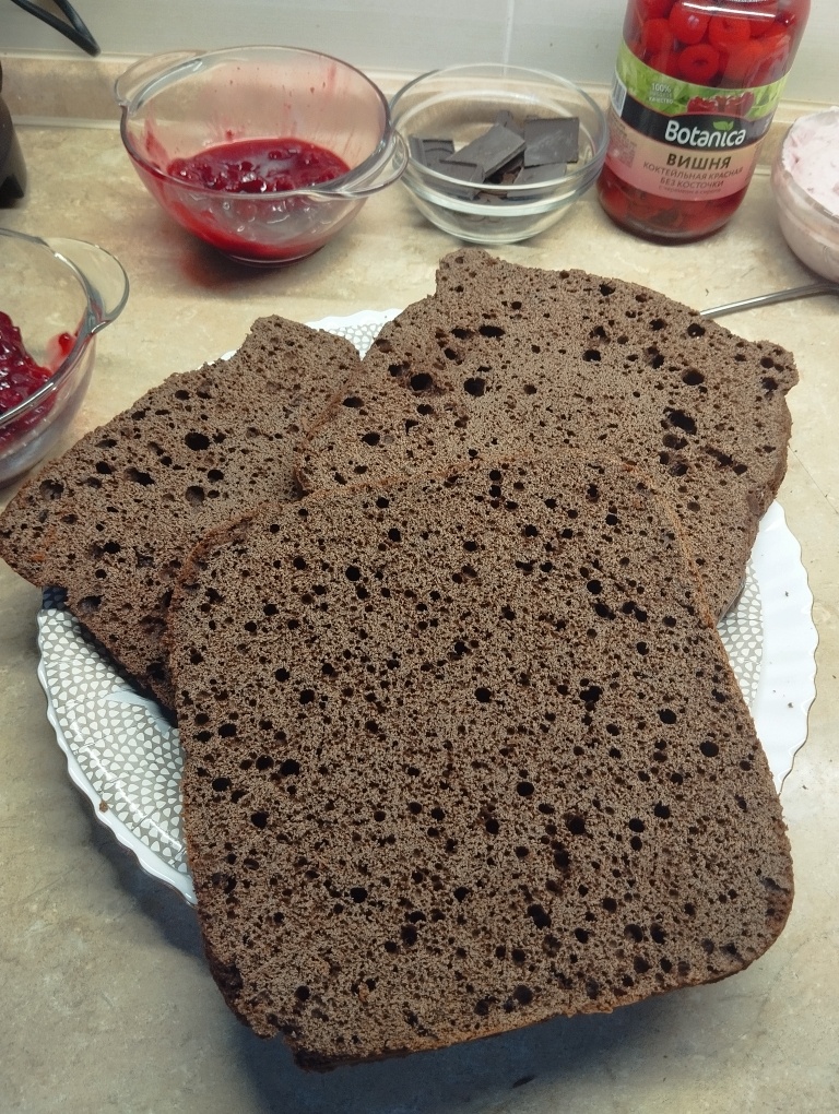 Давно делаю этот торт, это классика, сочетание кислой вишни с шоколадными коржами и сладким кремом. Думала, уже есть здесь рецепт. В этот раз я сделала бисквит поинтереснее, как на торт Ферреро Роше. Вместо кипятка используется сливочное масло и молоко. Должно быть вкуснее. Бисквит: Накрывала фольгой, пекла на более низкой температуре, да, не было большого горба, но все равно форма странная. И только нижний корж имеет хорошую форму квадрата. Может, буду печь на противне и вырезать по контуру потом, чтобы уже сделать наконец ровные коржи. Я заморочилась и делила крем и начинку на весах, чтобы было все ровно, но все бесполезно с такими кривыми коржами, торт получился кривой. Для крема взбила: 1упаковка сливок 30% (200мл) 2 упаковки творожного сыра (280гр) 120гр сгущенки Разделила на три части в две добавила вишневую начинку: 300гр вишни 100гр сахара 2ст.л крахмала Сварить и остудить. Измельчить 100гр и добавить в крем. Одна часть крема осталась белая, использовала для украшения. Тол