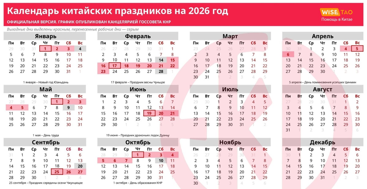⚡Опубликован официальный график праздничных дней в Китае на 2026 год. Девять праздничных дней на китайский Новый год! 1. Новый год (Юаньдань): 1 января. Выходные дни с 1 по 3 января. Рабочий день: 4 января. 2. Китайский Новый год (Праздник весны Чуньцзе): 17 февраля. Девять выходных дней с 15 по 23 февраля. Рабочие дни: 14 и 28 февраля. Многие компании и учреждения отдыхают дольше на 1-2 недели. 3. День поминовения усопших (Цинмин): 5 апреля. Три выходных дня с 4 по 6 апреля. 4. День труда: 1 мая. Пять выходных дней с 1 по 5 мая. Рабочий день: 9 мая. 5. Праздник драконьих лодок (Дуаньу): 19 июня. Три выходных дня с 19 по 21 июня. 6. Праздник середины осени (Чжунцюцзе): 25 сентября. Три выходных дня с 25 по 27 сентября. 7. День образования КНР: 1 октября. Cемь выходных дней с 1 по 7 октября. Рабочие дни: 20 сентября и 10 октября.