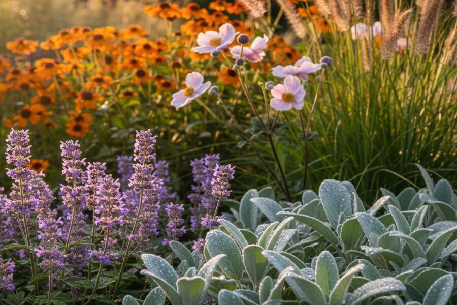 Для непрерывной декоративности комбинируйте растения с разными сроками цветения и с красивой листвой. Долго цветут: Котовник, Шалфей, Эхинацея, Рудбекия, Гелениум. Добавьте декоративные злаки (Пеннисетум, Просо) для структуры.