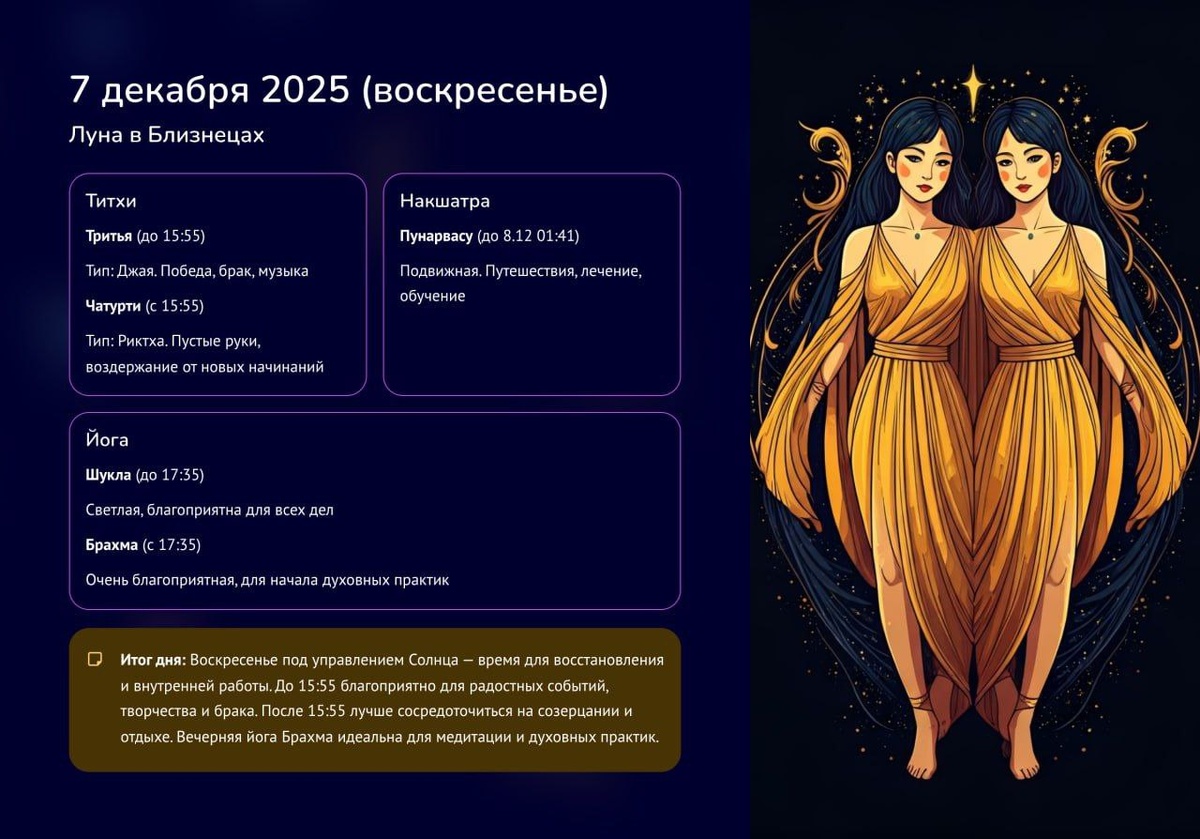 Астродайджест | 7 декабря 2025 | Воскресенье 🔴Ключевая тема дня: От застревания — к движению. От хаоса мыслей — к ясности и вдохновению. 🎯Энергия дня похожа на стрелу, которую оттягивают назад, чтобы метнуть дальше. Фокус смещается с внешней активности на внутреннюю перезагрузку и поиск новых идей. День начинается с интеллектуального подъема, но требует осторожности в действиях, и завершается мягкостью и чувствительности. Космический расклад: главные события 🌞 Солнце (в Скорпионе с Венерой и Меркурием) диктует тему глубины, трансформации и важных разговоров. ♐️ ВАЖНЫЙ ПЕРЕХОД! Марс, планета действий, покидает Скорпион и входит в Стрелец. Напор и страсть обретут философский вектор и жажду расширения горизонтов. ♊️ Луна (в Близнецах) соединяется с Юпитером — звездный аспект для ума! Жажда знаний, удача в общении, вдохновляющие идеи, ощущение «ветра в парусах». 🔴 Накшатра дня: Пунарвасу. Символ — «Возвращение домой» или колчан со стрелами. Идеальное время, чтобы перезагрузиться,