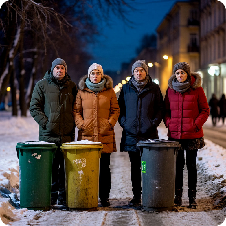 В 23:40 по улице шла странная группа: взрослые люди в праздничной, но помятой одежде, с фонариками в телефонах, направляющиеся к большому зелёному контейнеру у ворот.