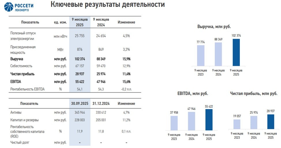 📊 Россети Ленэнерго. Отчет РСБУ за 9 месяцев 2025 г. Чистая прибыль = 28,9 млрд руб или 3,35 руб на акцию (+11% к прошлому году). Выручка и EBITDA растут на 16%. Себестоимость увеличилась на 13%. Ценообразование обыкновенных акций не имеет отношения к фундаментальному анализу и объясняется, скорее всего, лишь психологией поведения масс. Привилегированные акции - старожил моего основного портфеля и портфеля "Миллион для сына". Не является индивидуальной инвестиционной рекомендацией. Цели компании по прибыли и дивидендам за 2025 год - в статье на Sponsr 👈 #инвестпрактика #фундаментальныйанализ #РоссетиЛенэнерго #LSNG #LSNGP