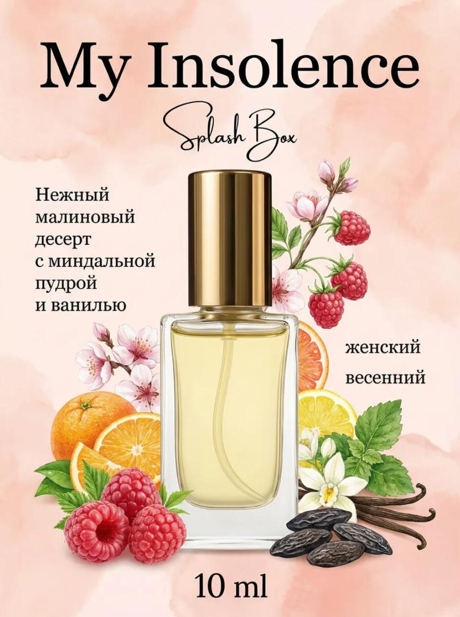 🤩🤩🤩🤩🤩🤩🤩🤩🤩 🤩🤩🤩🤩🤩🤩 🤩🤩🤩 🤩🤩🤩🤩🤩🤩🤩🤩🤩 Всем привет! 🤩 🤩 My Insolence - нежный малиновый десерт с мндальной пудрой и ванилью 🌟 Арт. 685275498 ▫️Аромат-референс: My Insolence Guerlain ▫️Пирамида: Верхние ноты: Малина и Цитрусы Средние ноты: Цветок миндаля и Жасмин Базовые ноты: Ваниль, Бобы тонка и Пачули ▫️Звучание: Аромат открывается с яркой и сочной ноты малины, которая придаёт свежесть и сладость, а цитрусы добавляют лёгкую, почти игривую нотку. Это начало даёт ощущение лёгкости и молодости, как летний день, наполненный яркими красками. В сердце аромата раскрываются более цветочные и утончённые ноты. Цветок миндаля приносит тёплую, почти ореховую сладость, а жасмин добавляет мягкую и чувственную цветочную глубину. Эти ноты создают гармоничное сочетание сладости и свежести, придавая аромату женственность и лёгкость. Завершается аромат на тёплой и сладкой базе. Ваниль и бобы тонка придают мягкость и сладость, создавая уютный, почти кремовый след. Пачули