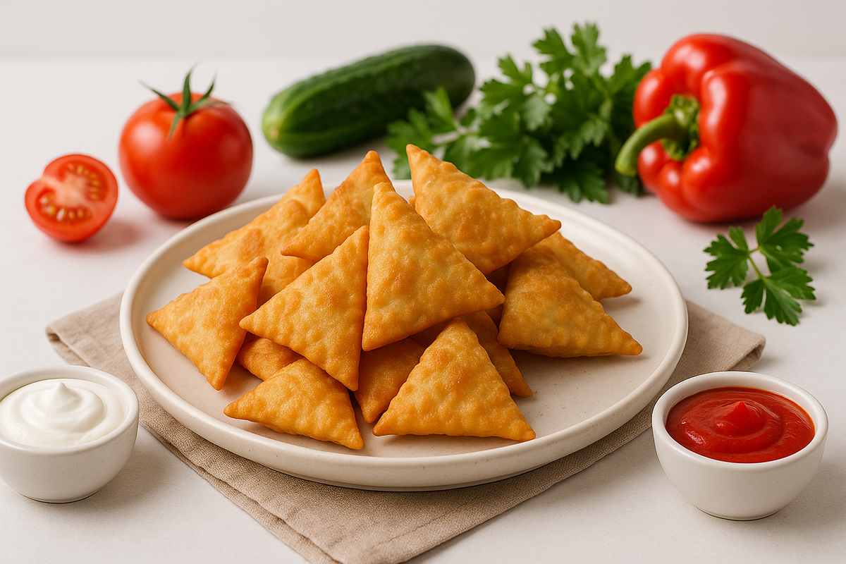 Хрустящие, сочные, с ароматом свежеобжаренного тонкого теста. Те самые, которые улетают быстрее, чем ты успеваешь их выложить на тарелку. Гости в восторге, время на кухне минимум. Рецепт (проверено и без лишних хлопот) Ингредиенты: Тонкие лаваши 2 шт Фарш говяжий 200 г Лук мелко рубленный 1 шт Чеснок 1 зубчик Соль, перец Ложка холодной воды Растительное масло для обжарки Как готовлю: Фарш смешиваю с луком, чесноком, солью и перцем. Лаваш режу на квадраты. На каждый кладу ложку начинки, складываю треугольником и прижимаю края вилкой. Разогреваю сковороду, добавляю ручей масла и обжариваю до золотистой корочки. Перед подачей кладу на бумажное полотенце. Подача Тарелка с чебуреками, рядом соус на основе сметаны и зелени. Тонкая посыпка паприки по краю. Контрастная светлая тарелка, чтобы подчеркнуть хрустящую корку. Лайфхаки и советы Чтобы начинка получилась сочной, обязательно добавляй ложку холодной воды. Не перегружай: по чайной ложке фарша на каждый мини чебурек. Если нет говя