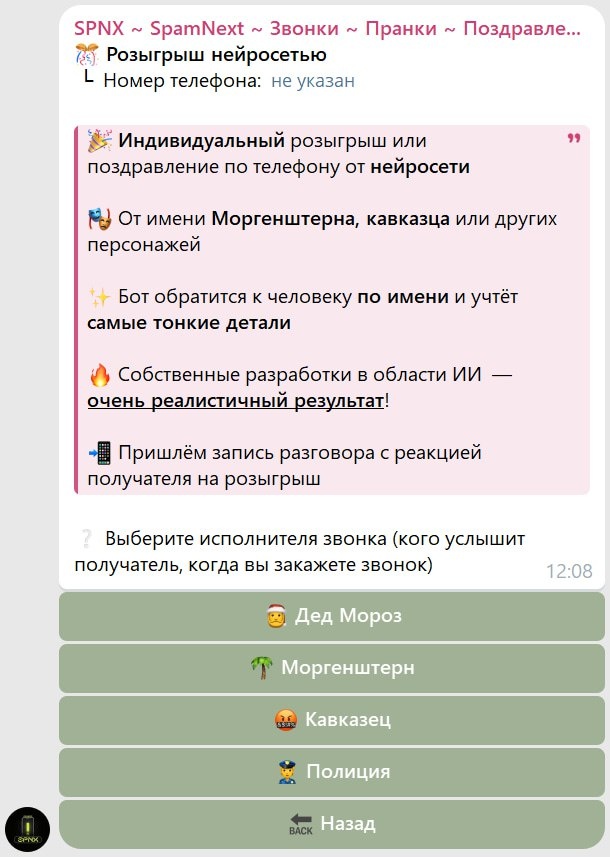 😍 ЭТО ПРОСТО АХ#ЕТЬ... 🥳 Встречайте: розыгрыш нейросетью. Теперь вы можете написать собственный розыгрыш и уточнить самые мелкие детали. 😕 Как же это работает? 1. Выбираете голос (например: Моргенштерн, кавказец или Дед Мороз). 2. Выбираете тему розыгрыша (о чем будет звонок). 3. Указываете имя получателя и другую информацию, которая будет полезна в контексте пранка (например: номер квартиры, модель автомобиля). 4. Нейросеть создаёт и озвучивает розыгрыш выбранным голосом. 5. Бот отправляет телефонный розыгрыш получателю и по окончании звонка присылает вам реакцию получателя. 🍿 Всё! Человек в недоумении и, возможно, даже в страхе, всё зависит от вашего запроса. 🤑 Ну и, конечно же, скидка в 25% 35%! А также специально для вас она будет длиться 24 48 часов! 🥳 А это ссылка на бота с пранком от нейросети — https://t.me/SmsShtormBot. 💅 А ну-ка бегом разыгрывать своего друга до усрачки! ProNext