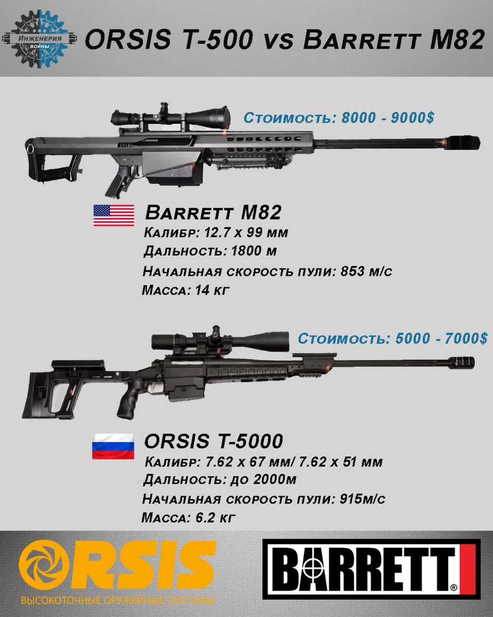 Представляем вашему вниманию сравнительную инфографику снайперских винтовок ORSIS T-500 и Barrett M82 Инженерия войны⚔️