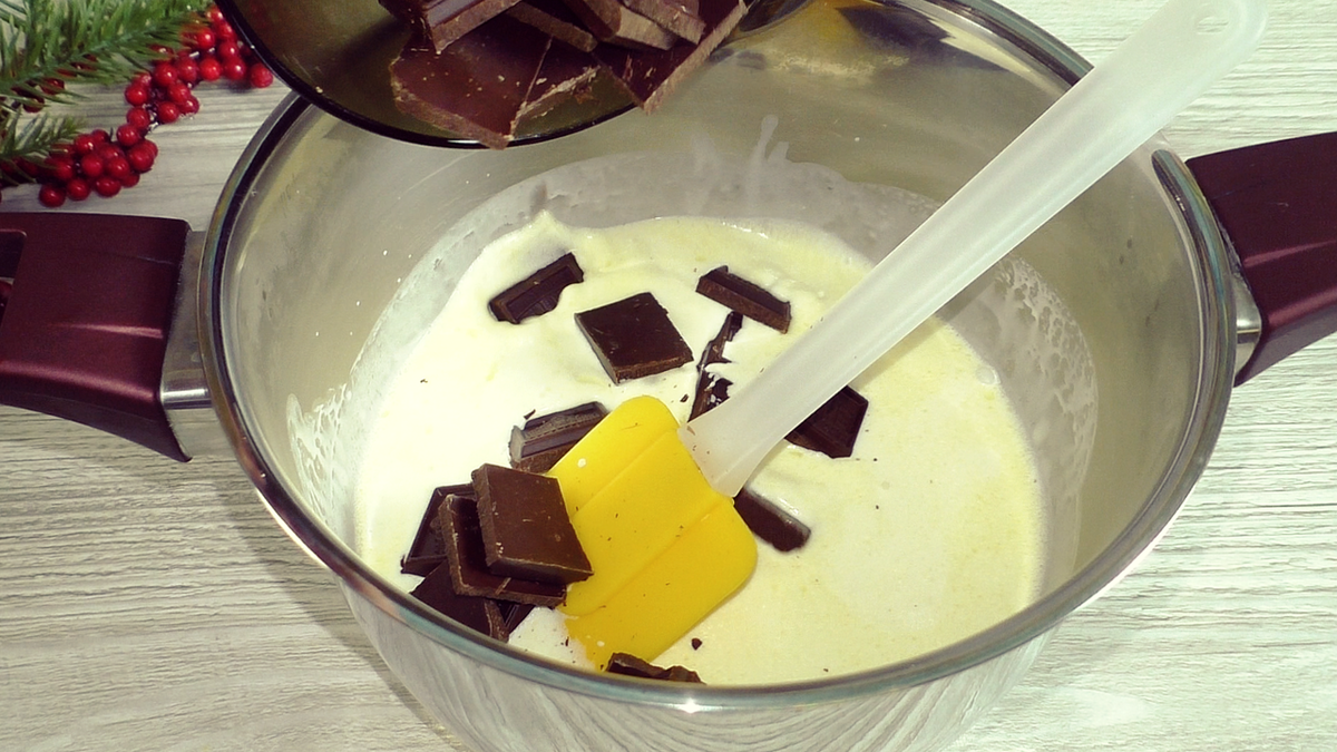 В горячие сливки добавляем шоколад, перемешиваем, накрываем плёнкой и убираем в холодильник, а лучше в морозилку на 1 час.
