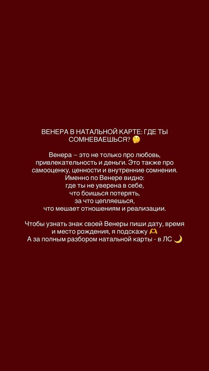 Чтобы узнать знак своей Венеры, пишите дату, время и место рождения, я подскажу ❤️