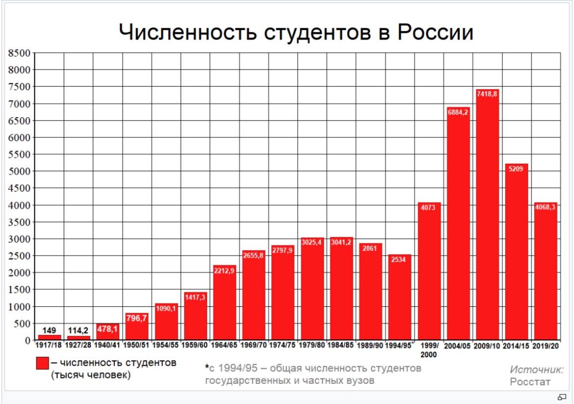 Меня тут обвинили во вранье про то, что в Союзе студентов было меньше чем сейчас.
