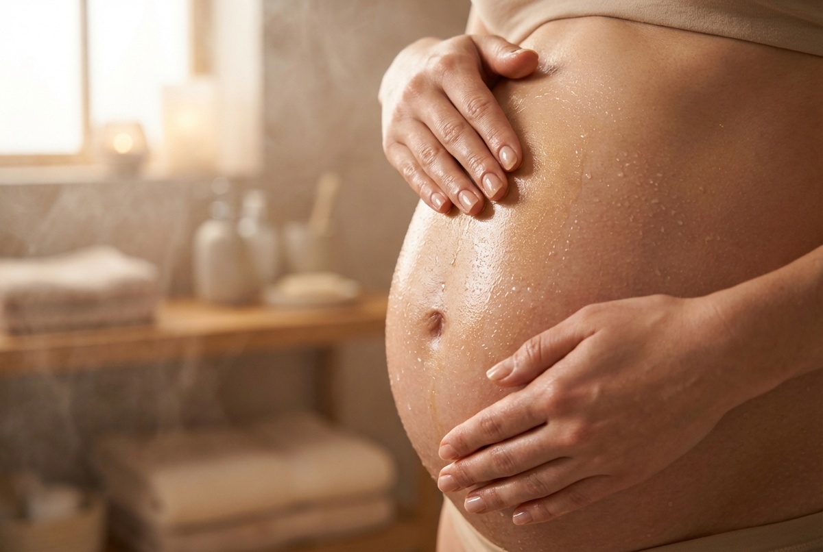 Во вторую беременность мы перестроили схему. Она убрала гели для душа "до скрипа", взяла наше масло и наносила его строго на влажную кожу дважды в день.