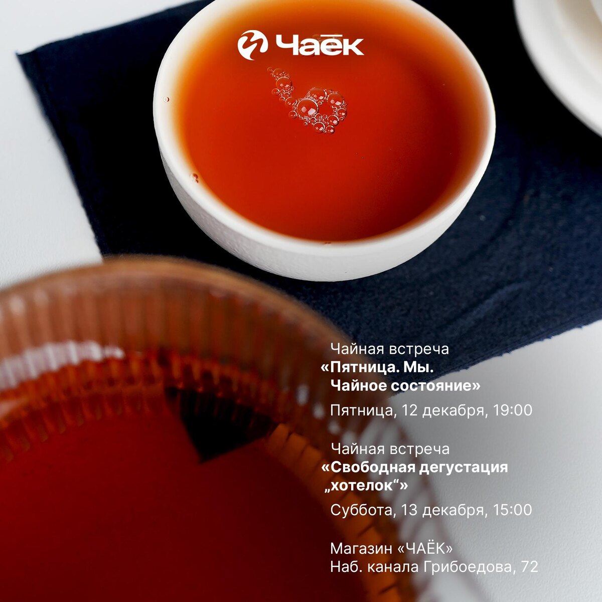 🍵 Чайные встречи 12 и 13 декабря 1. «Пятница. Мы. Чайное состояние» Проводим вечер в культурном месте с пиалочками пьянящих чаёв. Встреча пройдёт в классическом формате дегустации, центром которой будут дань цуны, шены и другие. Эти чаи славятся своим ярким чайным воздействием, ароматом, заставляющим прилипнуть к чахэ, и долгим приятным послевкусием. 📅 Пятница, 12 декабря, 19:00 👤 Юля 💵 900 ₽ 2. «Свободная дегустация „хотелок“» Приглашаем на эксклюзивную дегустацию чая, сет-лист которой формируется на основе вашего настроения! Вы можете предложить для дегустации сорта, которые хотели бы детально изучить под руководством эксперта. 📅 Суббота, 13 декабря, 15:00 👤 Юля 💵 1 000 ₽ 3. «Тет-а-тет» Вы можете записаться на индивидуальную чайную встречу, выбрав удобное для себя время, количество гостей и свою тему для мероприятия. 📅 Любой день 💵 от 3 500 ₽ 👉 Записаться Место встречи: магазин «ЧАЁК». Правила посещения и записи. Каждому гостю полагается бонус! #встреча@chaekshop