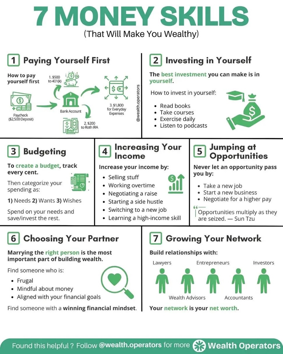 Большинство людей бедны не из-за обстоятельств, а из-за элементарных пробелов в денежных навыках. Ниже — семь фундаментальных действий, которые отделяют растущего человека от топчущегося на месте. Если внедрите хотя бы три — Ваш финансовый уровень начнёт меняться. Внедрите все семь — сорвёте ограничители. 1. Платите сначала себе — не банкам, не магазинам, не подпискам Стратегия проста до абсурда, но именно она отличает людей с капиталом от тех, кто живёт на остатки. Как делать на практике: автоматом отчисляйте минимум 10–20% дохода сразу после поступления денег; переводите их в отдельный счёт/брокера, а не «держите в голове»; тратьте только то, что осталось — и никогда наоборот. 2. Прокачивайте себя — это самый доходный актив Ценные навыки растут в цене быстрее акций. Факт. Что реально работает: книги (1 книга = 1 новая мысль, которая может изменить доход); курсы по конкретным навыкам, а не «саморазвитие для души»; ежедневная физическая активность — мозг работает лучше; каче