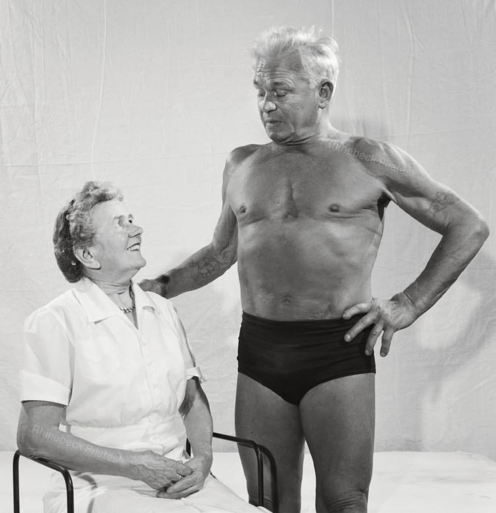 Джозеф Пилатес и его жена Клара. 1958 год. Джозефа я привыкла представлять именно таким, с голым торсом и в трусах. Потому что нет в одежде смысла, когда мы говорим о пилатесе. Джозеф косит на правый глаз. Как и мой сын. Удивительное совпадение - у Макара и Джозефа день рождения в один день - 9 декабря! Уже скоро будем отмечать. #стрелец #контрология #пилатес #деньрождения #мечташатовамакара #замечтой
