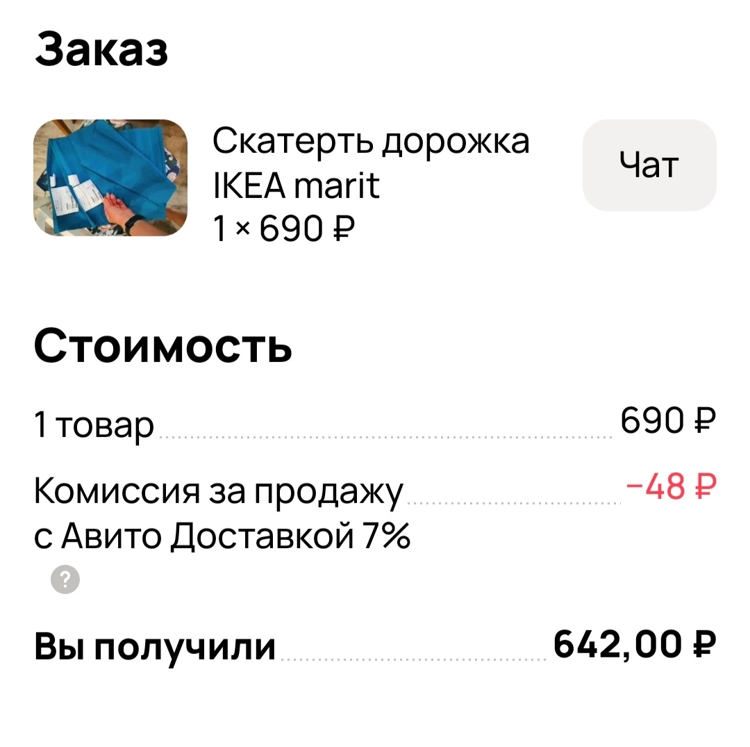 Вторая продажа. Абсолютно непонятная мне дорожка. Накрыла один раз на чаепитие, залили чаем, пятна не отстирались. Валялась в кухонном ящике, пока я не открыла для себя наш секретный чат продавцов Авито. Там мне рассказали 1000 и 1 способ вернуть вещи товарный вид, пятна от чая я вывела и получила за продажу более 800р) ах, да, купила дорожку за 189р😁