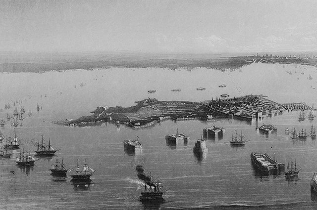 Кронштадт, украшенный лесом мачт, фортами и гранитными