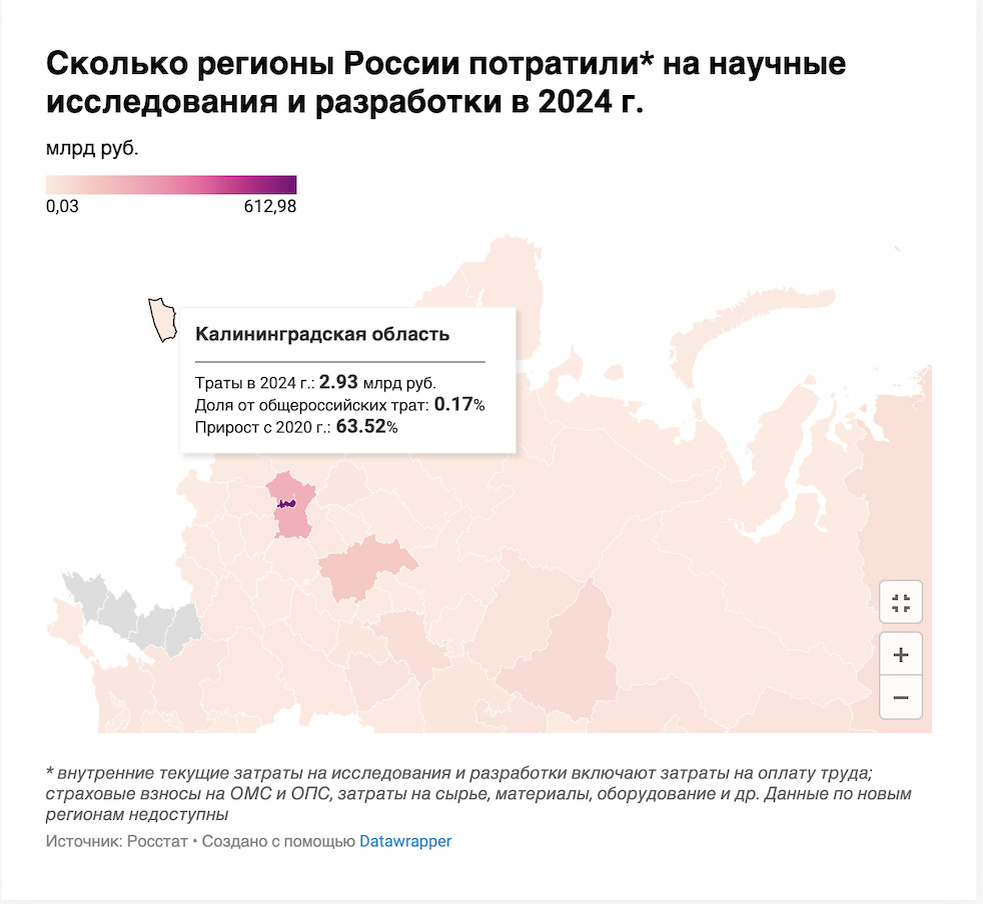 Несмотря на общероссийский рост инвестиций в науку, Калининградская область сохраняет крайне низкую долю в национальном объеме научных разработок. По данным Росстата, на регион приходится всего 0,17% от общих расходов страны в этой сфере. Абсолютные затраты области на исследования и разработки в 2024 году составили менее 3 миллиардов рублей. Об этом пишут Ведомости. Общий контекст по России демонстрирует положительную динамику: за пять лет (с 2020 по 2024 гг.) расходы на науку в стране выросли в 1,5 раза, а на инновации — вдвое. Однако географическое распределение финансирования крайне неравномерно. Более трети всех затрат (около 613 млрд руб.) сосредоточено в Москве, а на десять регионов-лидеров приходится 80% общероссийских расходов. На этом фоне позиция Калининградской области выглядит скромно, хотя в относительном выражении регион показывает прогресс. За период с 2020 по 2024 год вложения области в научные исследования увеличились почти на 63%. Тем не менее, по абсолютным показател