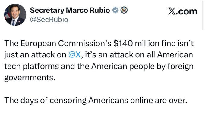 RUBIO THREATENS EU FOR 'ATTACK ON ALL AMERICAN PEOPLE