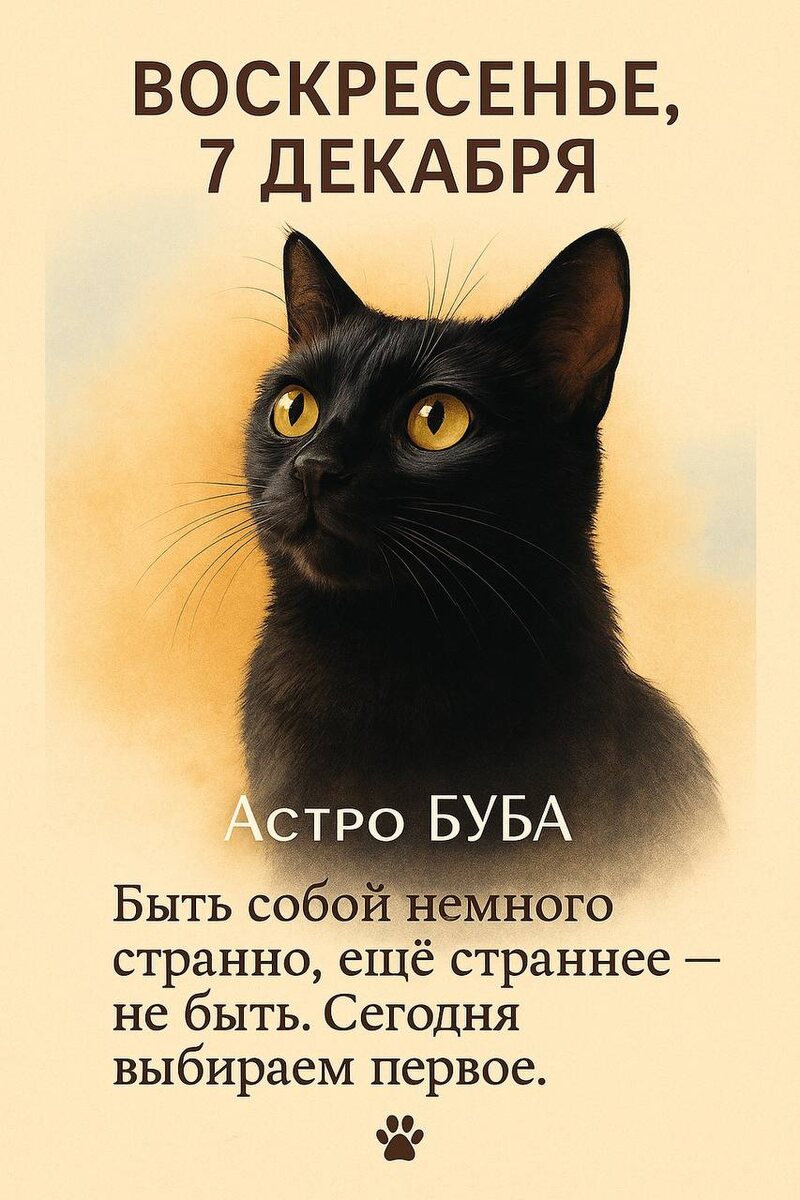 🗓 Воскресенье, 7 декабря Астропогода: Воскресенье принесёт редкую ясность: день будто расправляет плечи после недели и предлагает вам сделать то, что давно просится в душу. Мягкая энергия, никаких рывков — только спокойный выбор и тихие удовольствия. Хорошо подходит для отдыха, для личных решений, для финальных точек и мягких новых стартов. ♈ Овен 💼 Бизнес: не дави, сегодня важнее восстановиться. 💞 Отношения: кто-то хочет тебя услышать — дай шанс разговору. ☕ Здоровье: подари телу долгий, ленивый утренний ритуал. ♉ Телец 💼 Бизнес: мысли будут складываться чётко — запиши идеи. 💞 Отношения: спокойствие — ваш главный союзник. ☕ Здоровье: отдых на свежем воздухе перезагрузит лучше сна. ♊ Близнецы 💼 Бизнес: случится маленькое озарение — не игнорируй. 💞 Отношения: прояви мягкость — это откроет сердце другого. ☕ Здоровье: побереги нервы, ограни себя от лишней болтовни. ♋ Рак 💼 Бизнес: не все решения нужно принимать сегодня — отсрочка пойдёт на пользу. 💞 Отношения: теплая вст