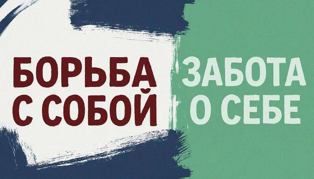 Вы когда-нибудь замечали этот внутренний дискомфорт после, казалось бы, правильных действий? "Отдохнул", а будто пробежал марафон. "Поработал над собой", а чувствуешь себя опустошенным. Часто мы путаем жестокость к себе с силой воли, а насилие над потребностями — с дисциплиной. Посмотрите на эту инфографику. Это — ключ к диагностике. Три признака, что вы не заботитесь о себе, а ведете с собой партизанскую войну. 1. Отдых. Должна vs Разрешаю БОРЬБА: Вы заставляете себя "отдохнуть", потому что прочитали про выгорание. Ставите таймер, лежите на диване, смотрите в потолок и мысленно составляете список дел. Отдых как приказ, как еще одна задача в чек-листе. Результат: напряжение только растет. ЗАБОТА: Вы чувствуете усталость и даете себе возможность остановиться. Без уговоров и чувства вины. Может, это 20 минут с книгой, может — просто лежать и смотреть в окно. Разрешаете себе ничего не делать. Результат: настоящее восстановление. 2. Слабость. Клеймо vs Принятие БОРЬБА. Вы ошиблись, уст