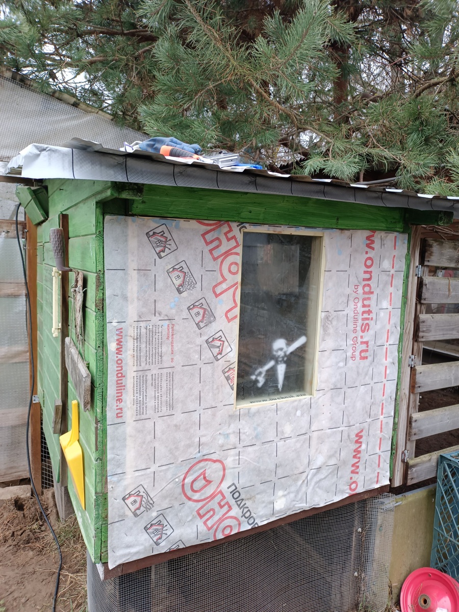 Утеплитель закрыл ветровлаго защитой. Сразу же вагонкой покрывать стену не стал. Мне нужно скорей цыплят сюда перенести. А внешний декор можно и позже сделать.
