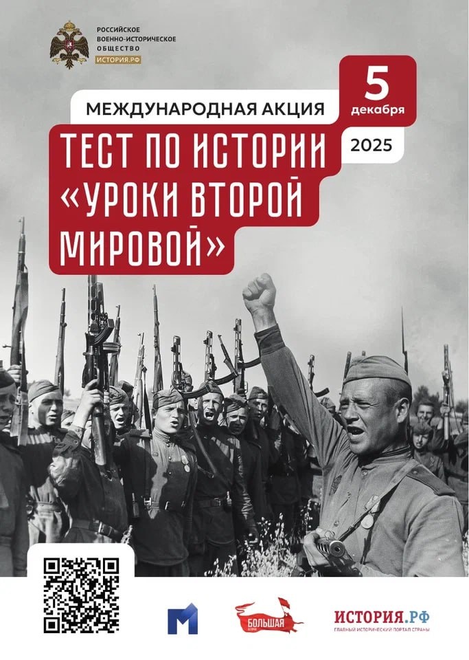 5 декабря 2025 года педагоги, учащиеся и родители приняли участие в Международной акции "Тест по истории "Уроки Второй мировой" (в оффлайн и онлайн форматах). Инициаторами и организаторами акции являются Молодежные парламенты России совместно с Российским военно-историческим обществом. Тест состоит из 40 вопросов (базового и профильного уровней), на решение которого отводится 40 минут.