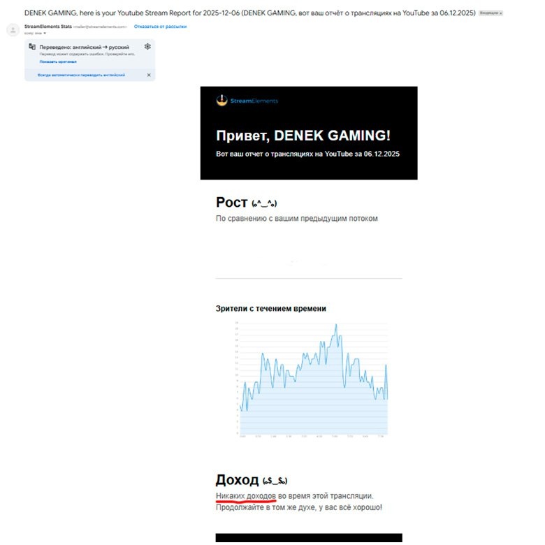 Какая то новая фича от ютуба) пришел на почту отчет о трансляции вчерашней, пишут : Доходов трансляции нет, продолжайте в том же духе, у вас все хорошо😅😂🤣🫡