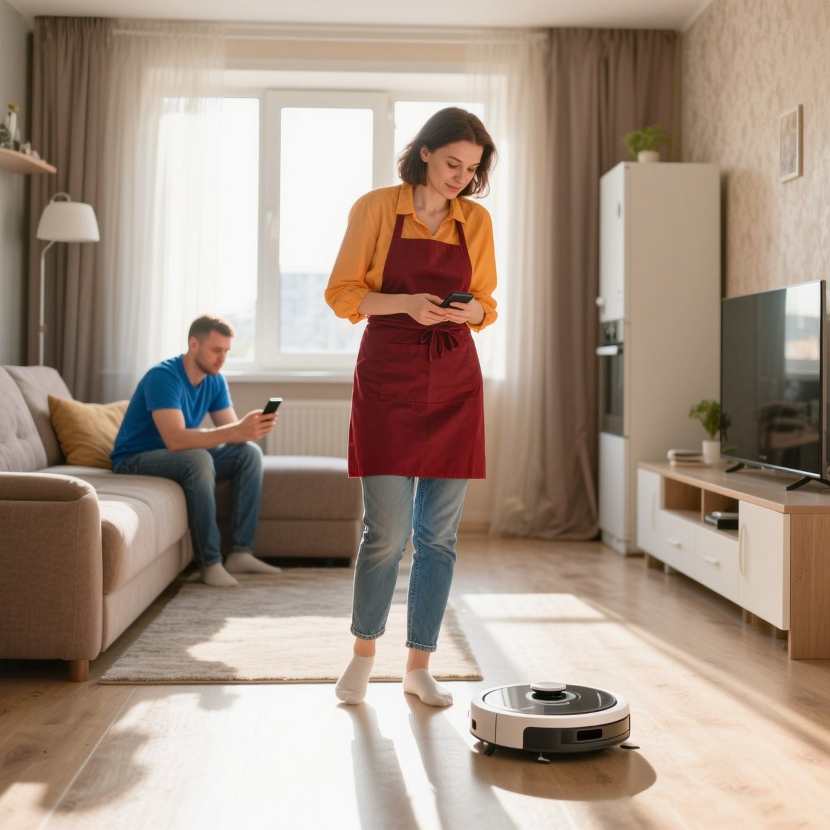 Вечером, когда привезли пылесос и Марина распаковывала его, Виктор вернулся. Молча прошёл в комнату, лёг на диван, уткнулся в телефон. Она закончила с установкой, настроила приложение, запустила первую уборку. Робот деловито загудел, покатил по комнатам, объезжая препятствия.
