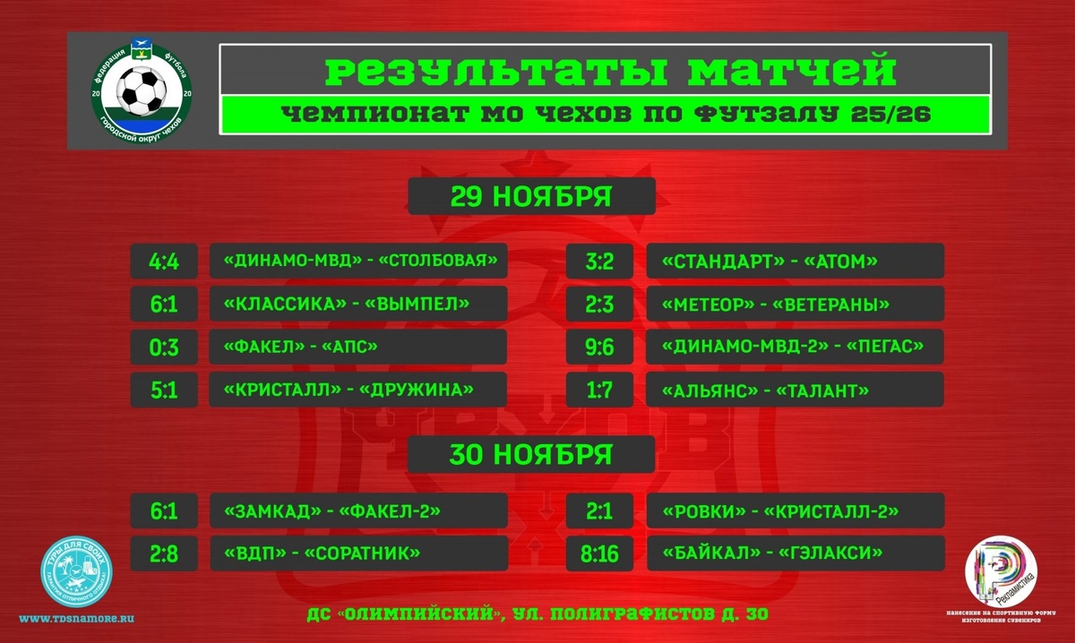 ✨ Наши новости! ⚽ 29 -30 ноября на малой спортивной арене Дворца спорта «Олимпийский» имени В.С. Максимова» продолжился «Чемпионат муниципального округа Чехов по футзалу» сезона 2025/2026 гг. Результаты матчей: 29 ноября: 🔹 «Динамо-МВД» - «Столбовая» - 4:4; 🔹 «Классика» - «Вымпел» - 6:1; 🔹 «Факел» - «АПС» - 0:3; 🔹 «Кристалл» - «Дружина» - 5:1; 🔹 «Стандарт» - «Атом» - 3:2; 🔹 «Метеор» - «Ветераны» - 2:3; 🔹 «Динамо-МВД-2» - «Пегас» - 9:6; 🔹 «Альянс» - «Талант» - 1:7. 🏢 Дворец спорта Олимпийский имени В.С. Максимова 📍 г. Чехов, ул. Полиграфистов, стр.30 ⭐Разместить публикацию ⭐Поддержать голосом ✅ Спортивный Чехов https://dzen.ru/id/66f02564335c7475d84fbf87 http://vk.com/chehov_sport http://dzen.ru/chehov_sport
