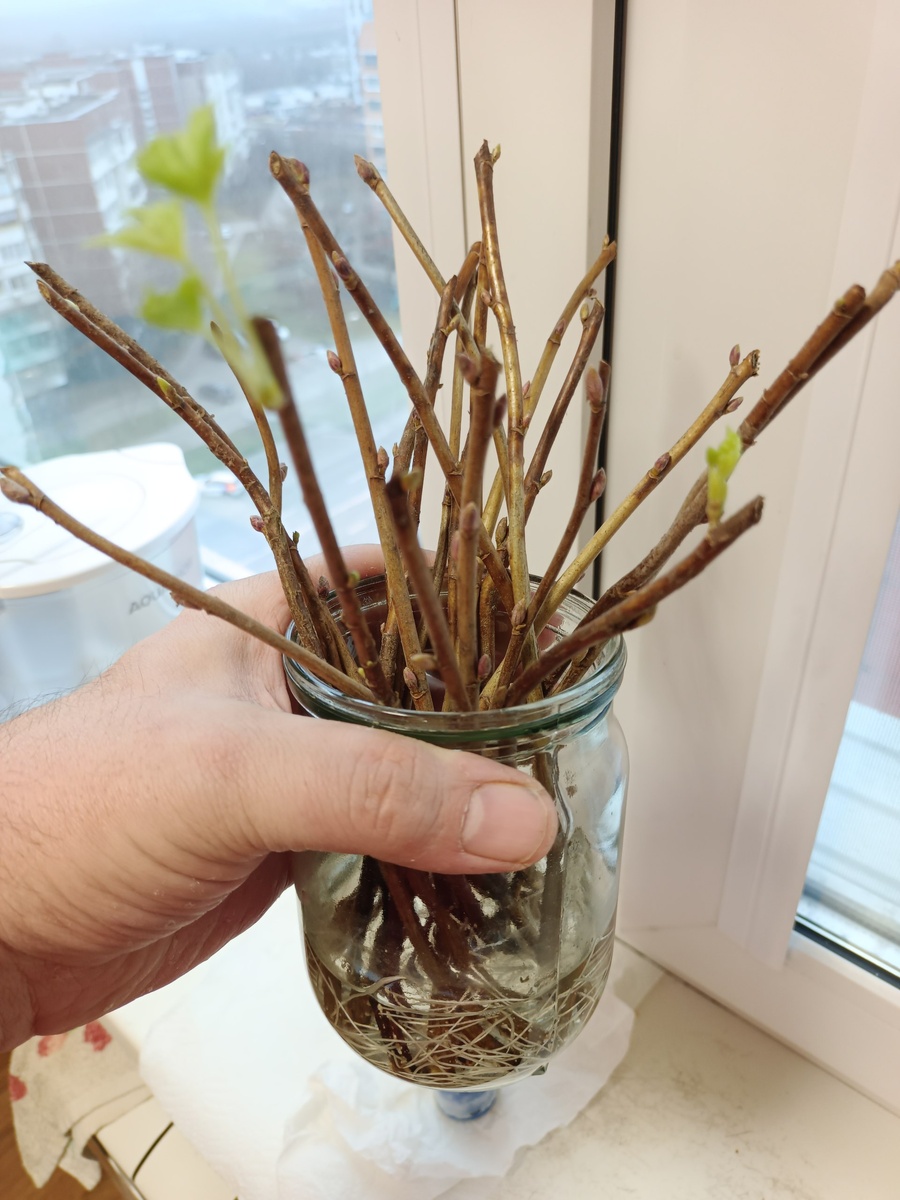 Смотрю в квартирных условиях ветки смородины прорастают быстрей, чем у меня дома на подоконнике. Видать температурный режим сказывается. У меня подоконник не горячий. Корней у веточек ещё нет, хотя почки набухли. В городских же условиях и корни вовсю пошли, да листочки уже стали раскрываться.