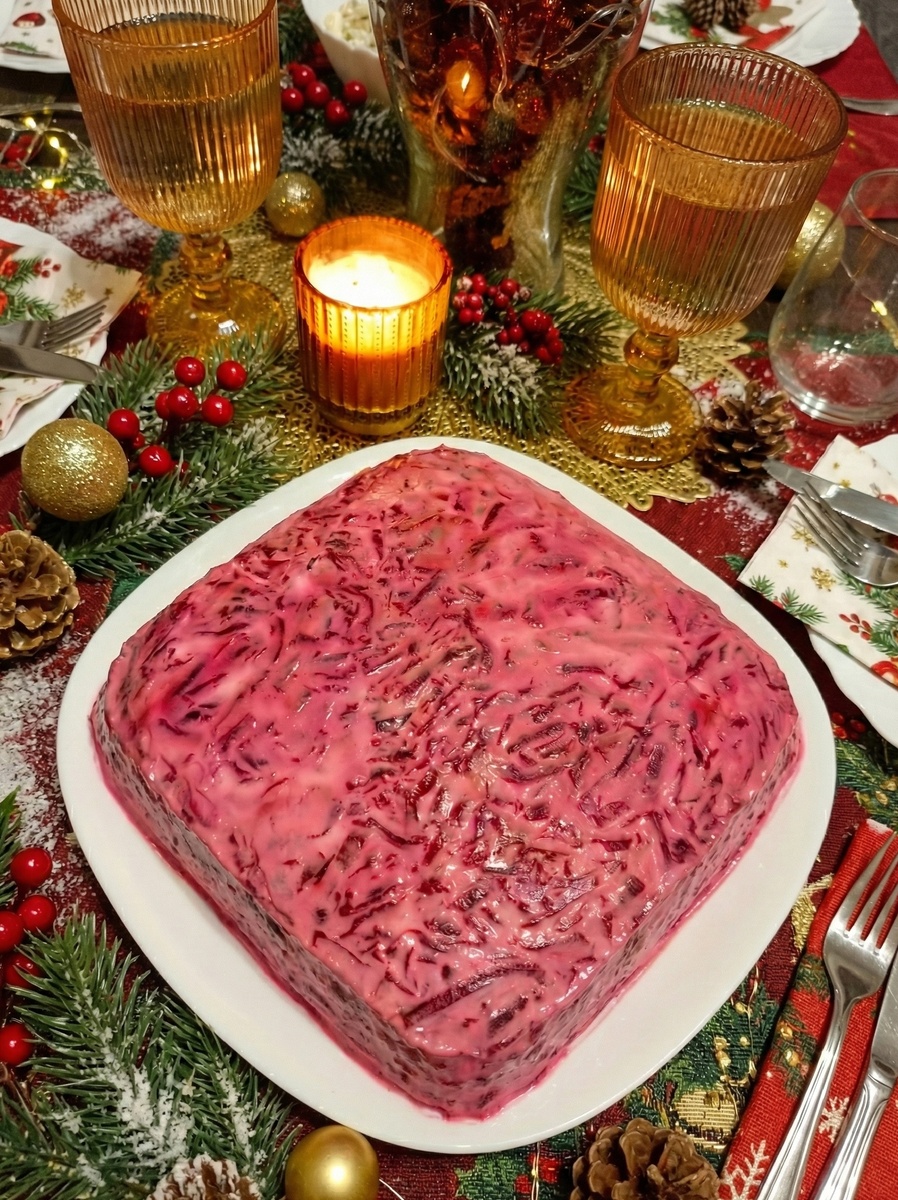 Друзья, чувствуете? Воздух уже наполняется этим особенным ожиданием чуда. Мы начинаем подготовку к самому прекрасному и волшебному празднику — Новому году! 🎉 И, конечно, какой новогодний стол без короля (или королевы?) салатов — Сельди под шубой! Это блюдо — настоящий символ праздника. В каждой семье его готовят по-разному. Кто-то прячет слой сельди в самую середину, кто-то для свежести добавляет яблоко, кто-то исключает яйца, а кто-то не представляет «Шубу» без вареной моркови. Сегодня я предлагаю вам наш семейный рецепт. Так готовила моя бабушка, и поверьте, ее селедка имела невероятный успех и дома, и на работе. Многие, попробовав, отмечали, что именно этот вариант — самый вкусный и гармоничный. Кстати, мама моего мужа готовит этот салат почти так же, но добавляет морковь. Мы же с вами приготовим версию без моркови — именно ту, которую так любили гости моей бабушки. 📜 Немного истории Вокруг этого салата ходит множество легенд. Самая популярная гласит, что блюдо придумал купец Анас